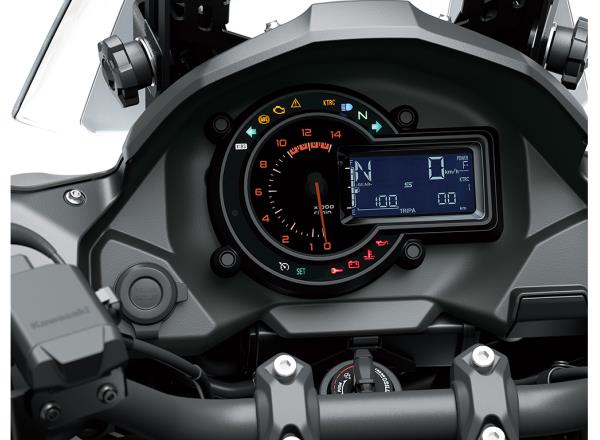 Instrumentation with an advanced, high-tech design gives the Versys 1100 cockpit a very high-class appearance. The analogue-style tachometer is complemented by a full digital LCD screen.