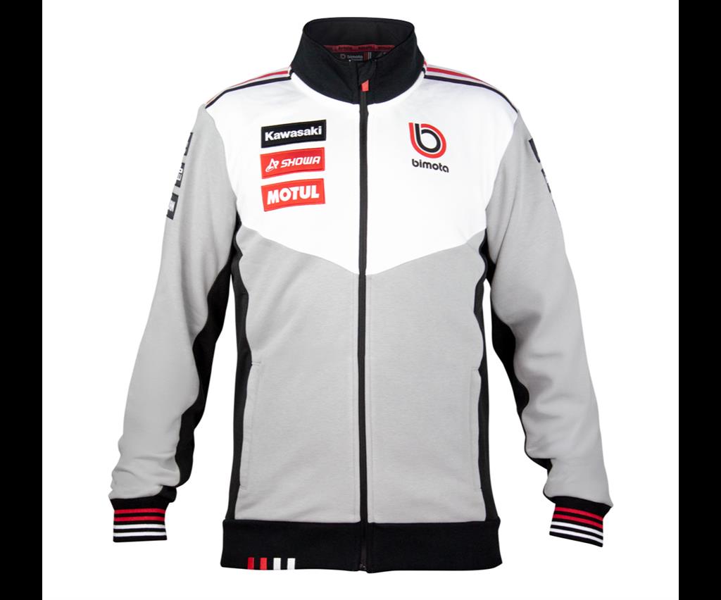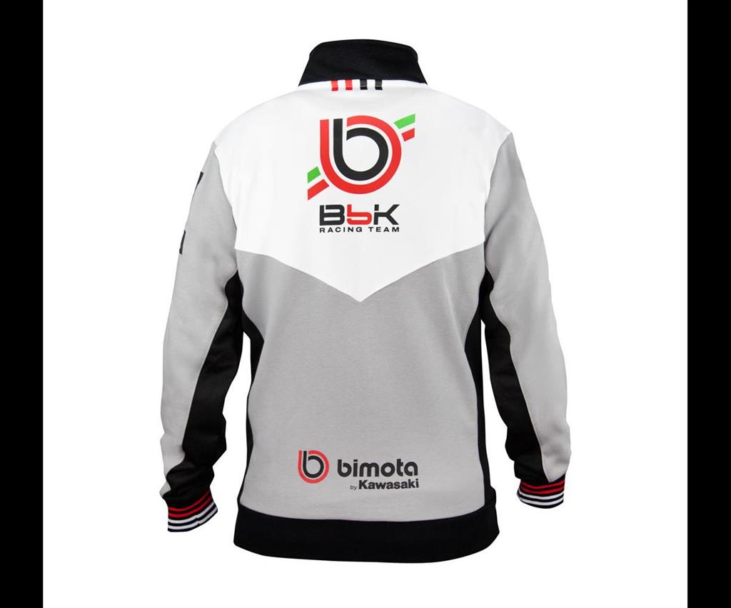 A full-zipped Bimota/BbKRT branded sweater in grey, white and black, with a stand-up collar, customary zipped outer pockets and the sleeve cuffs are banded in red and white. The waist rib boasts with embroidered red and white Bimota markings.