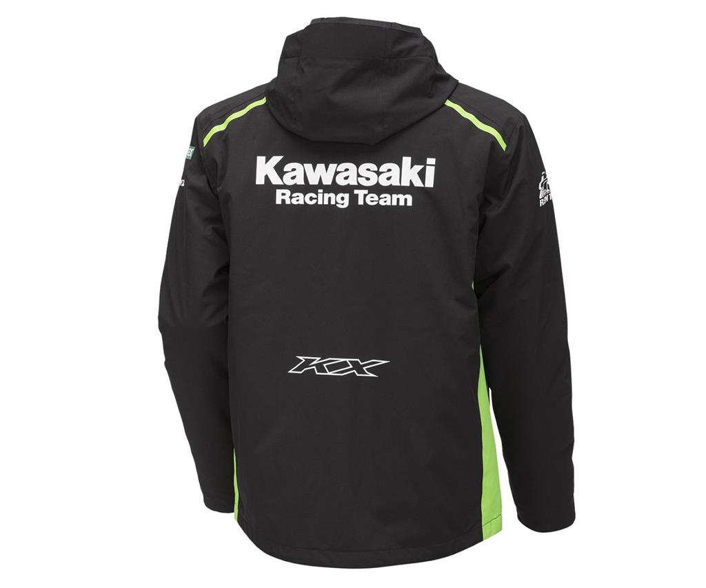 Kawasaki MXGP-Team replica two-in-one jacket with detachable inner thermos-liner, zipped inner and outer pockets and internal sleeve cuff. Seams are taped to keep the rain at bay. Unzip the liner to convert the jacket for mid-season use.  Also available in an extra small size.