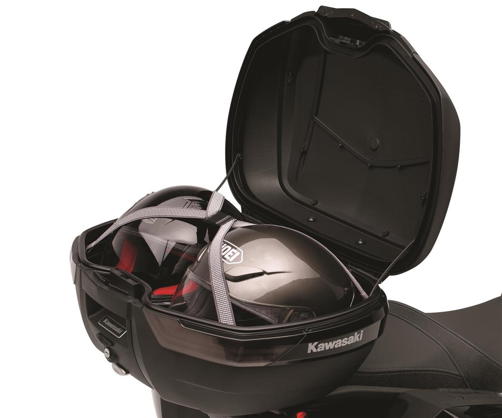 Top case providing a spacious 47 litres of storage space. Will fit two of most full face helmets. Matching cover in bike color to be ordered separately, as well as the anodized aluminium deco plate. Bracket has lateral movement damping mechanism for improved reliablity.