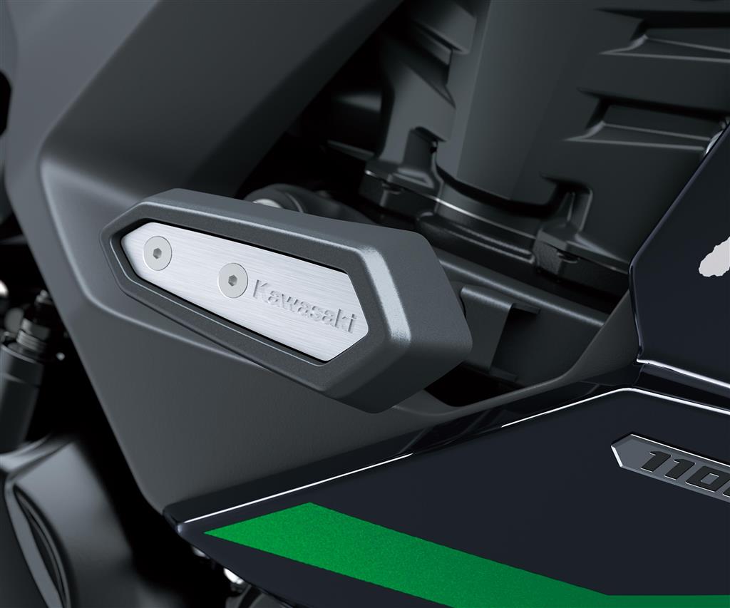 Stylish high-density black ABS plastic frame slider pads with aluminium insert and Kawasaki logo. Gives extra protection for bodywork.